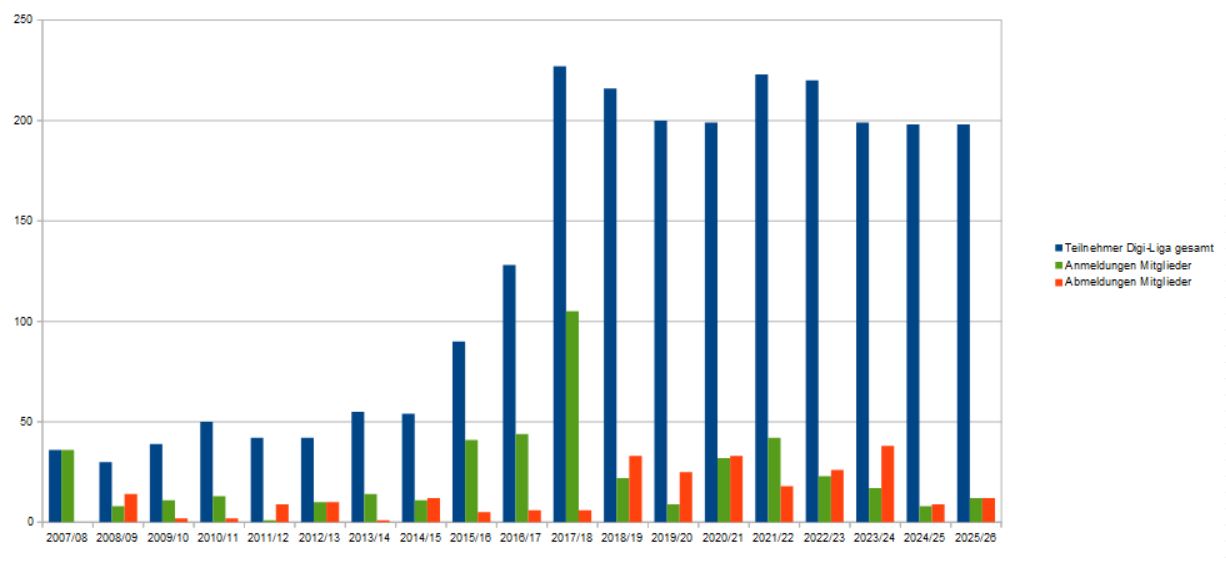 Mitgliederentwicklung von 2007 bis 22.August 2025 -(Stand 22.08.2025: keine freien Plätze für Spielbetrieb ohne Oberliga für die Saison 2025/26 ...aktuellster Stand auf Kicktipp Seite)- Ein Eintritt in die Digi-Liga bis zum Erreichen der absoluten Höchstzahl von 256 ist jederzeit möglich, auch in einer laufenden Saison!!!- ---- |